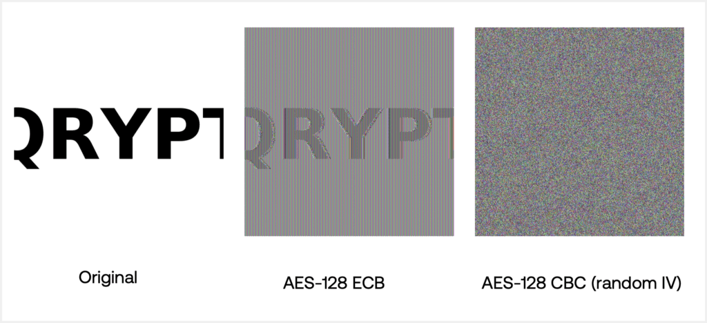 Consider how frequently AES confidentiality has been compromised by implementation errors alone. AES-ECB is the canonical example: because identical 16-byte blocks encrypt to identical ciphertext blocks, structural information in images, documents, and binary formats leaks directly through encryption. In earlier demonstrations, a large “QRYPT” image encrypted under ECB still visibly resembled the original, despite being encrypted with a mathematically strong cipher. AES didn’t break. Our simplistic assumption that ECB “should be good enough” did.