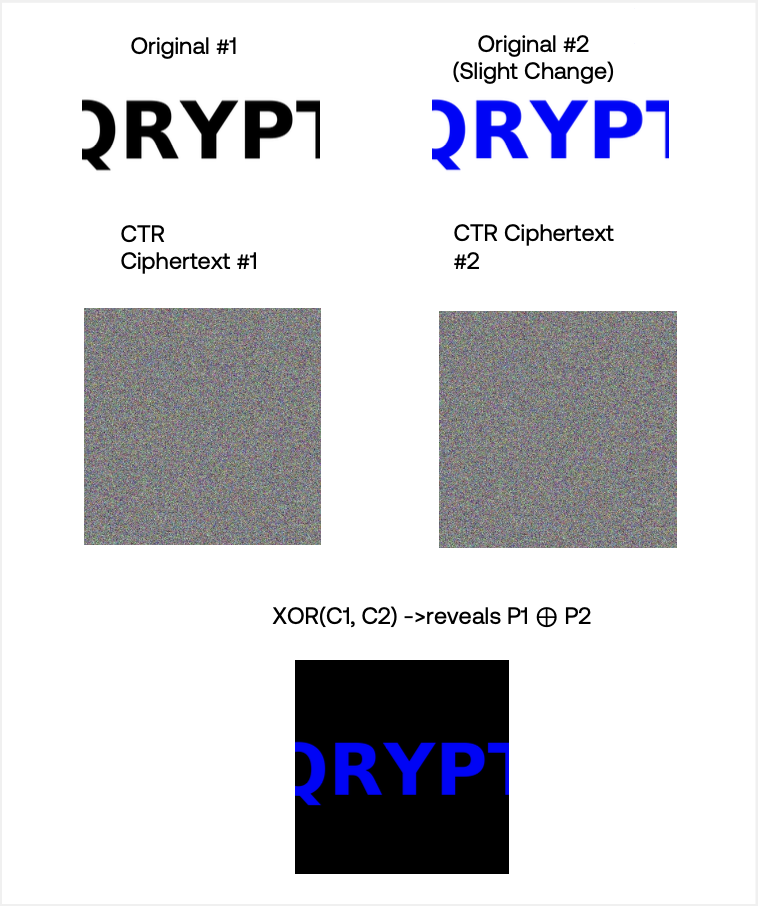 CTR mode suffers the same fundamental weakness. In our plaintext-only AES-CTR demonstration, encrypting two related plaintexts with the same key and counter let us XOR their ciphertexts and immediately obtain the XOR of the plaintexts. If even one plaintext is known or guessed, the other is revealed instantly. No quantum computer is required, just a single nonce misuse.